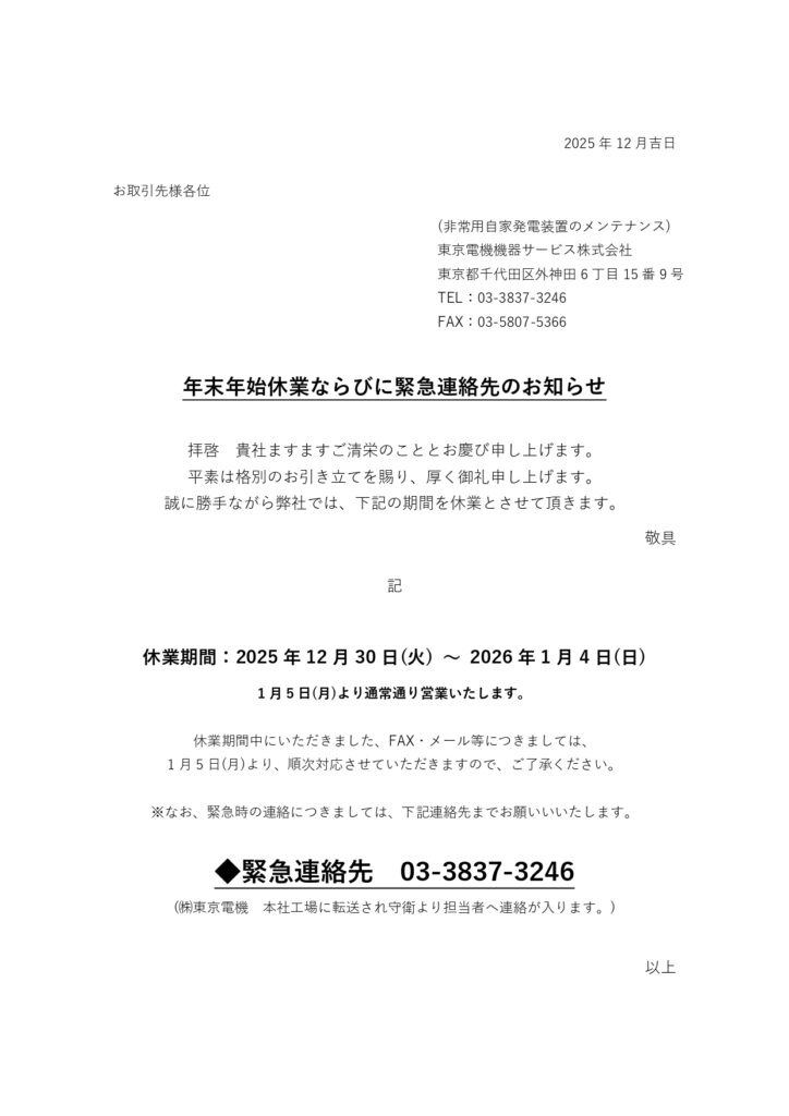 年末年始休業ならびに緊急連絡先のお知らせ